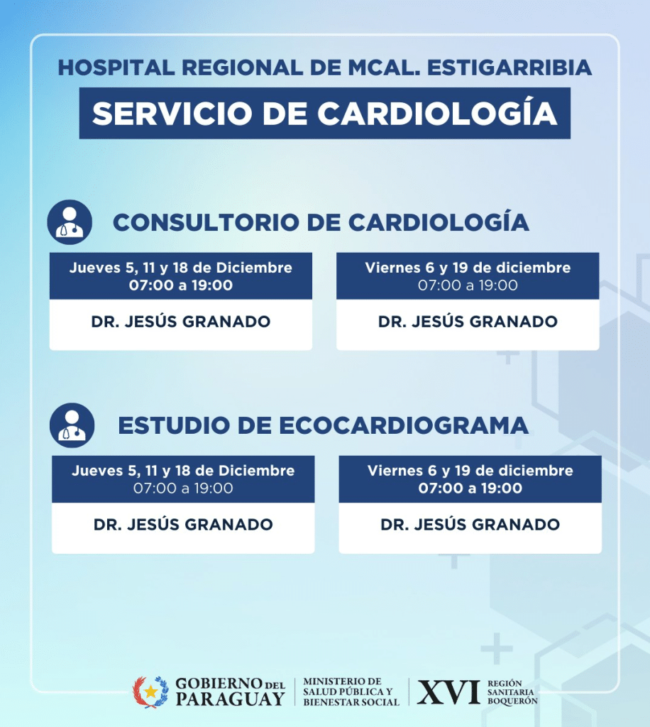 Die Leiterin des Gesundheits-Regionalbüros Nr. 16 Boquerón, Frau Doktor Ester Bogado, sagte der ZP-30-Redaktion, die neue Installation und Sprechstundenangebote seien wichtig für die Chaco-Bewohner, die zu staatlichen Einrichtungen kommen. Sie bräuchten für eine Ultraschall-Aufnahme des Herzens künftig nicht mehr unbedingt in die Hauptstadt reisen. Sprechstunden mit einem Herzspezialisten bietet das Krankenhaus im Dezember an folgenden Tagen an: am 5., 6. und 11., sowie am 18. Und 19. Dezember, mit dem Facharzt Doktor Jesús Granado. (ZP-30/XVI Región Sanitaria)