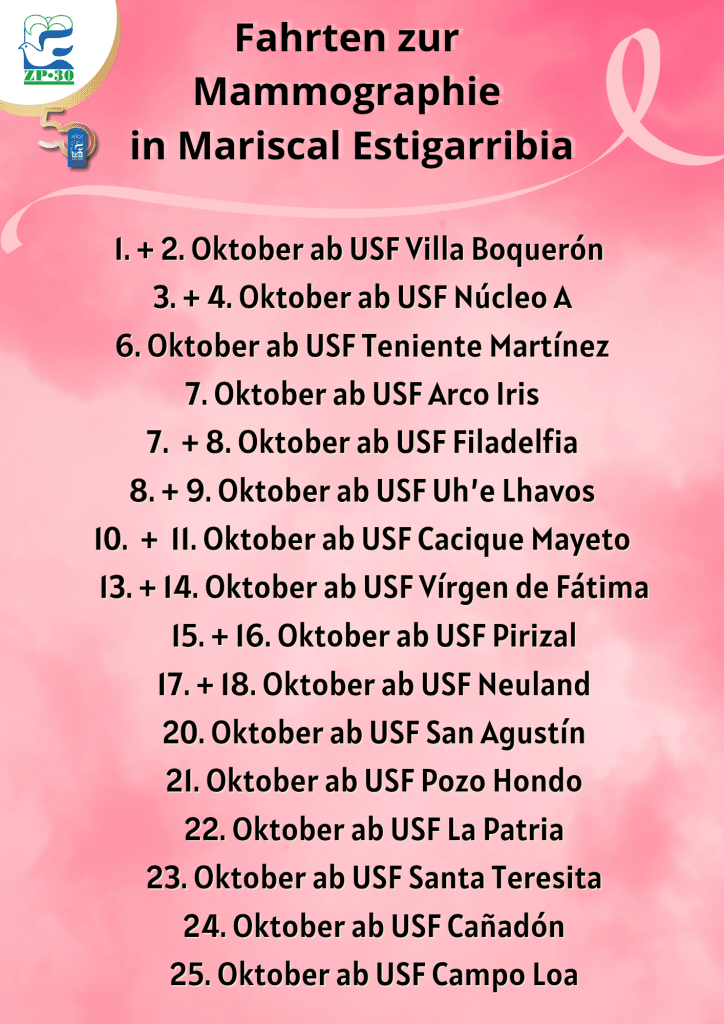 In der Zone am Pilcomayo sehen die Fahrten zu Mammographie-Untersuchungen in Mariscal Estigarribia wie folgt aus: am 13. und 14. Oktober von der Krankenstation Vírgen de Fátima aus, am 15. und 16. von Pirizal. Von Neuland aus werden Fahrten am 17. und 18. Oktober organisiert. Weiter geht’s mit San Agustín am 20. und Pozo Hondo am 21. Oktober. La Patria am 22. Im Distrikt Mariscal Estigarribia, wo es die kleinsten Entfernungen zum Regionalkrankenhaus gibt, werden drei Fahrten angeboten: Von der Krankenstation Santa Teresita am 23., von der in Cañadón am 24. und von Campo Loa am 25. Oktober. Das Symbol für die Kampagne gegen Brustkrebs ist die rosa Schleife; – Das Motto „Hagamos de la prevención una tradición”, zu Deutsch: “machen wir aus der Vorbeugung eine Tradition“. (ZP-30/Archiv/Gobernación Boquerón/Municipalidad Filadelfia)