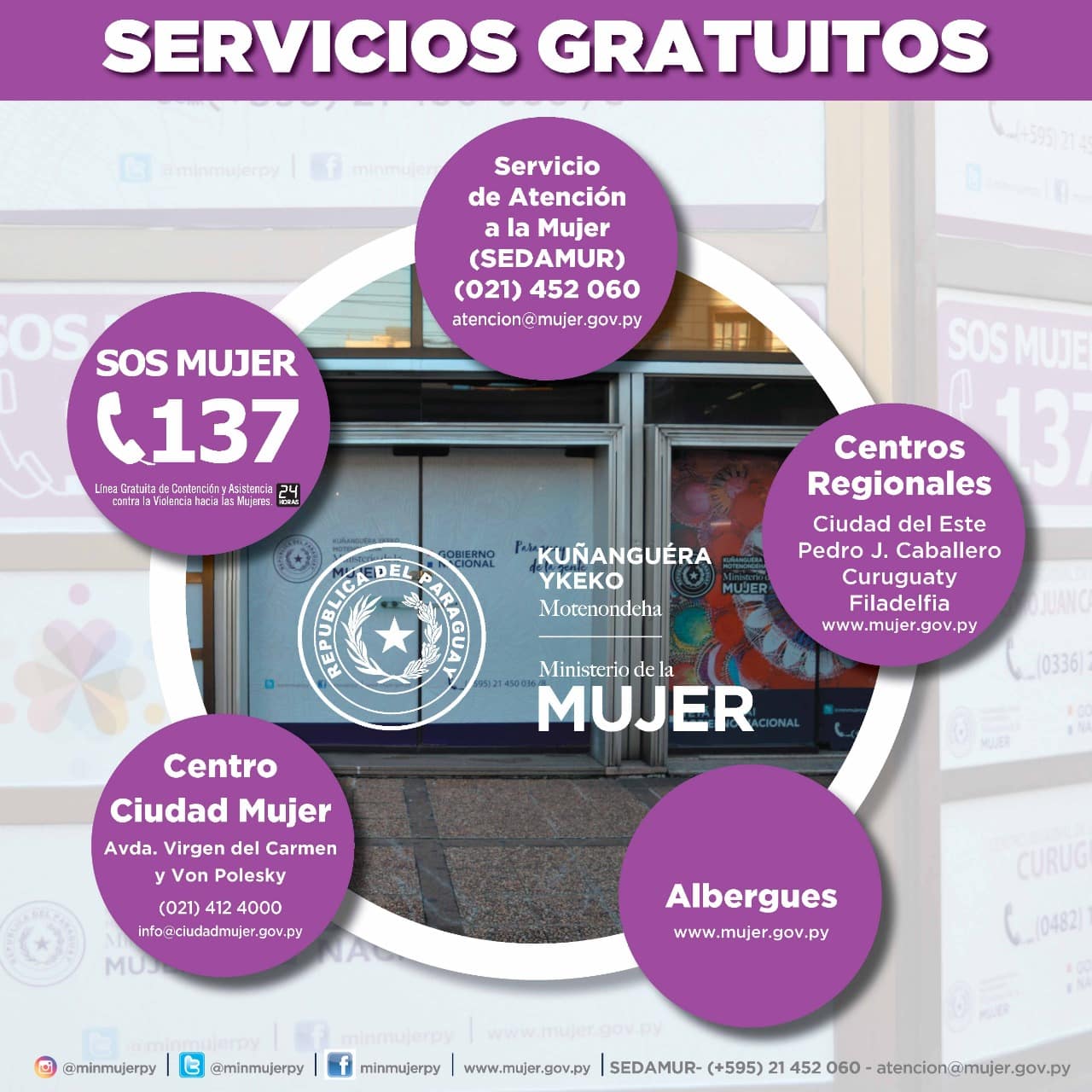 También existen las lineas de whatsaap 0981-112-127 y el 0981-110-104 como lineas de emergencia y también las 24 horas. Por otro lado están a disposición albergues para las personas de victimas de violencia y victimas de tratas. La viceministra Zayas destacó devuelta las campañas que vienen impulsando como la de «metete» que es un empoderamiento de la ciudadanía que tiene la potestad de denunciar los casos de violencia hicieron que esas cifras no se han disparado, ciertamente siguen los casos pero que van en descenso.